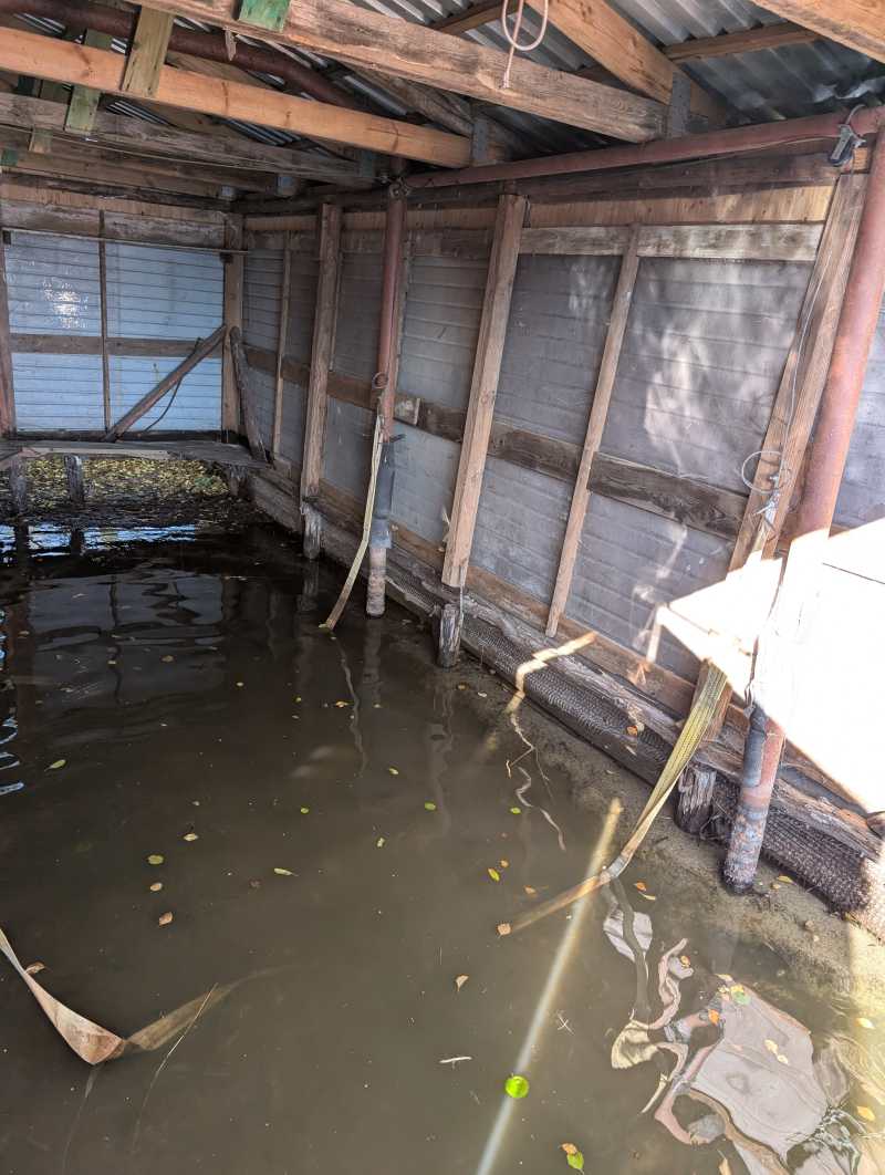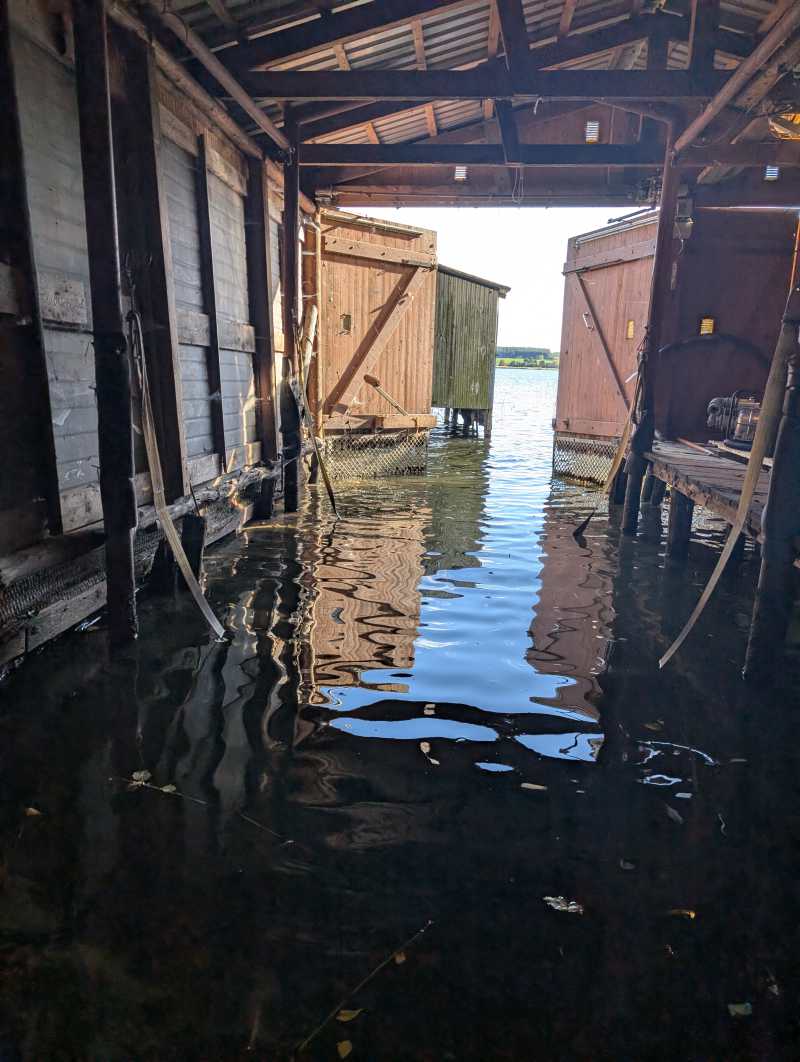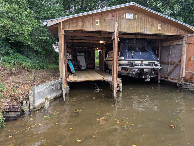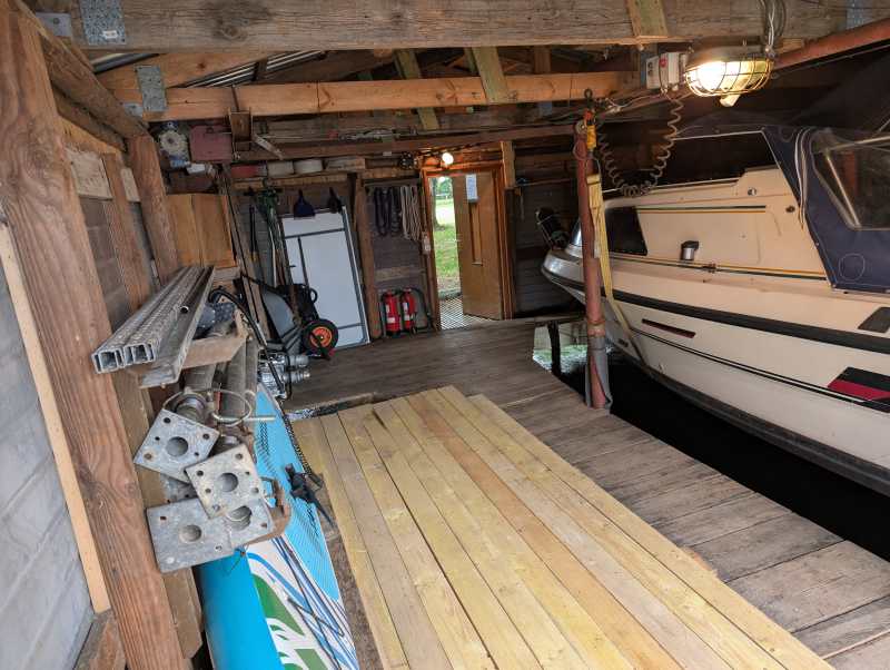 Der Bootsschuppen hat ein elektrisches Tor, eine elektrische Hebevorrichtung und ein manuelles Tor.